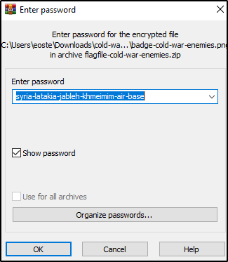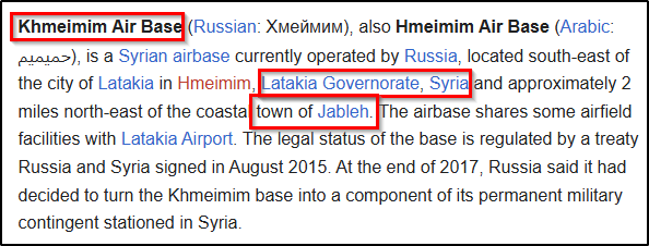 We already discovered the name of the air base, so we can substitute ‘airbasename’ with ‘khmeimim’. Though it is currently operated by Russia, we can see the base is located in the town of Jableh in the Latakia governate of Syria. For my US audience, a governate is an administrative subdivision, or an area or territory within a larger country that is controlled by a governor, hence the name governate. So now that we have all the information, lets plug it into the flag format and grab our badge!