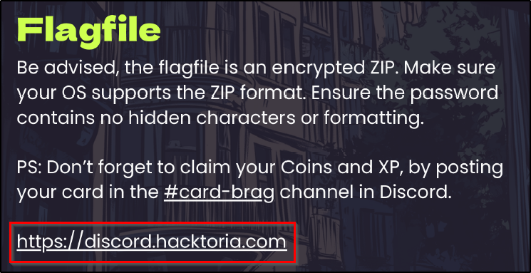 Hacktoria has a discord channel, which can be found at https://discord.hacktoria.com. I haven’t done it yet, but apparently you can post the badge in the #card-brag channel of their discord for some fun rewards.