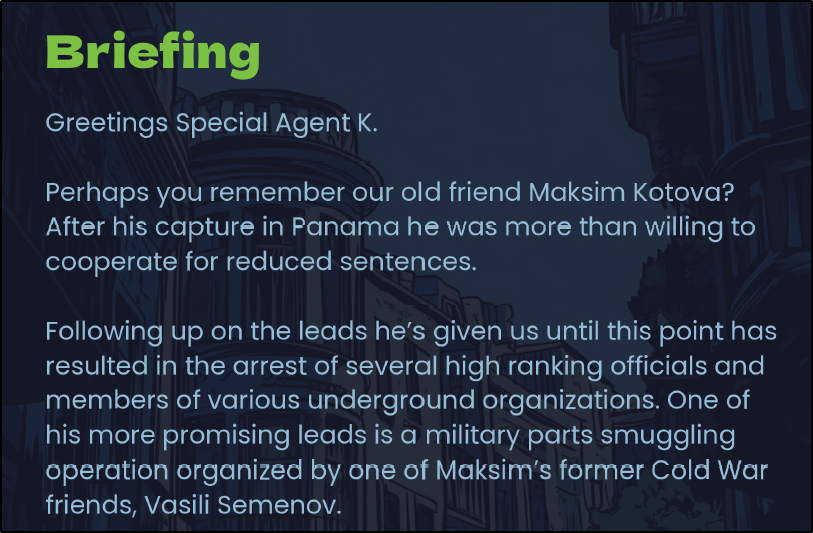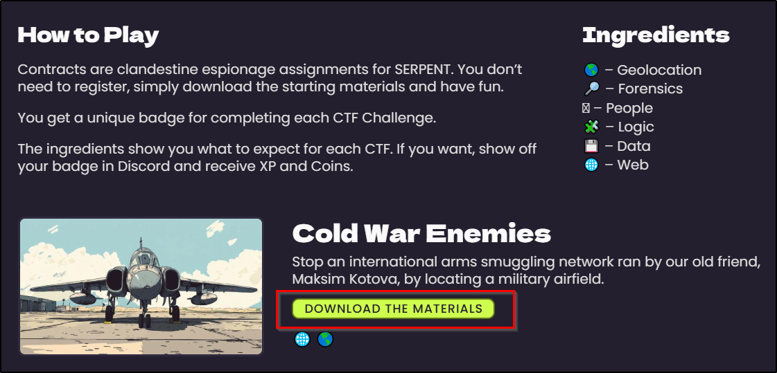 For this writeup, we will be starting with an easy contract. Once you click “Easy Contracts,” you will be taken to a page with instructions on how to play, a key indicating different skills used in each mission, and a list of easy contracts from which to choose. In the list of contracts, you will see a relevant image, a title, a description, and icons that indicate which specific skills from the key above will be used for that contract. We will be starting with the very first contract, “Cold War Enemies.” To get started, just click ‘Download the Materials’, unzip the file, and you’re ready to begin!