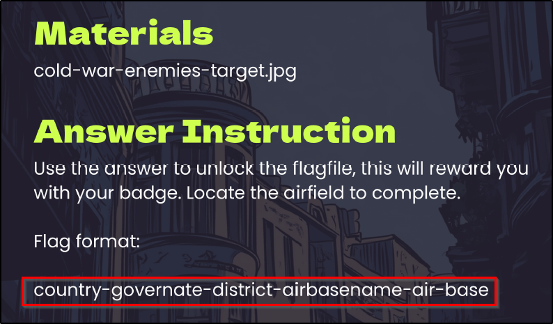Looks like we got everything we needed right away. Lets plug that information into our flag password format. As a reminder, the format for the flag is: country-governate-district-airbasename-air-base.