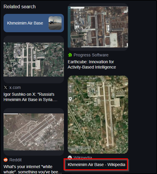 Looking at our results, we get the name of an air base right away, the Khmeimim Air Base. If we compare this image to the image in the cold-war-enemies-target.jpg file, it looks like this is our base. Click on the Wikipedia page for the Khmeimim Air Base to get some more information.