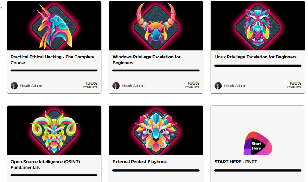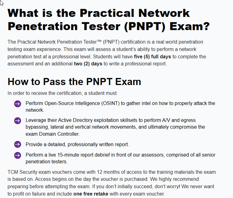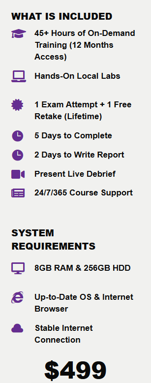 The $499 price is hefty, but still low for a professional certification. Included in that price tag is one free retake valid for a lifetime as well as almost 50 hours of training material with 12 months of access. The PNPT bundle includes 5 courses total with clear, concise, step-by-step instructional videos that are easy to follow for some hands on experience. The courses include: