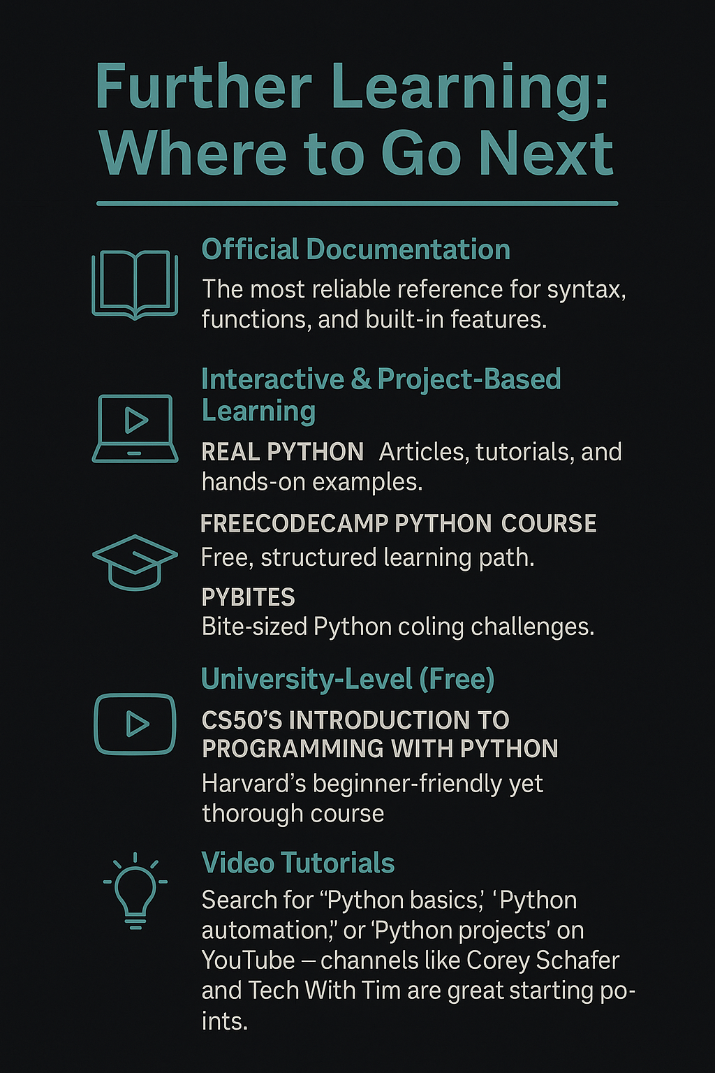 There’s no shortage of quality resources to guide your learning. The official Python documentation is always a good place to start. Courses on Real Python, freeCodeCamp, or PyBites offer beginner-friendly lessons and hands-on challenges. One of my personal favorites is Harvard’s free online CS50: Introduction to Programming with Python course – it’s clear, thorough, and combines video lectures with practical assignments, ending in a final project of your choice. If you’re a visual learner, YouTube has hundreds of excellent tutorials covering everything from basic syntax to advanced projects.